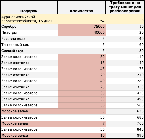 Во вкладке "Подарки" активным игрокам, которые совершают покупке в акционном магазине, мастеровые дарят полезные презенты! Единственным условием для получения подарков является трата определенного количества монет (чем больше потрачено монет, тем больше подарков получит игрок). А первый подарок в виде 7% ауры олимпийской работоспособности на 15 дней все могут получить без каких-либо условий с момента начала акции - то есть БЕСПЛАТНО!