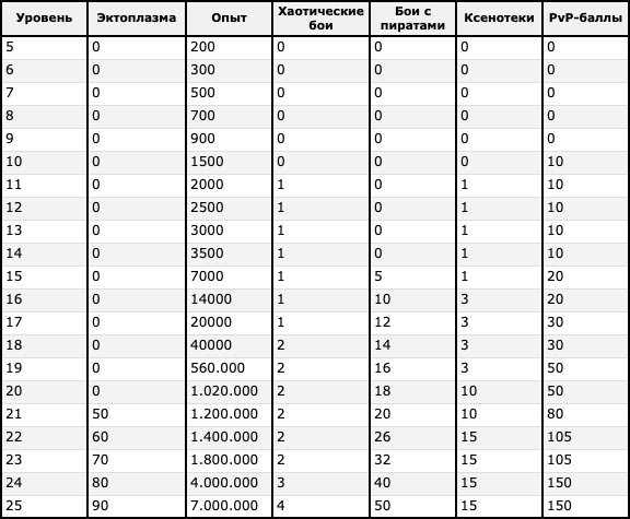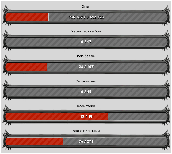 Члены клана, зарабатывая опыт, пвп, эктоплазму, ксенотеки, а также участвуя в хаотических боях и боях с пиратами заполняют данные шкалы, принося себе и клану пользу. Немного нюансов по тому, что учитывается в данные шкалы: