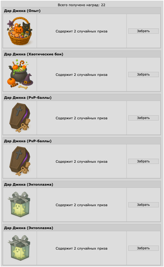 Вкладка "Дары Джека". Как уже говорилось выше, при заполнении шкалы все члены клана, которые внесли хотя бы, (0,1*уровень_соклана)% в ее заполнение, получают личный "Дар Джека", забрать который можно в данной вкладке:
