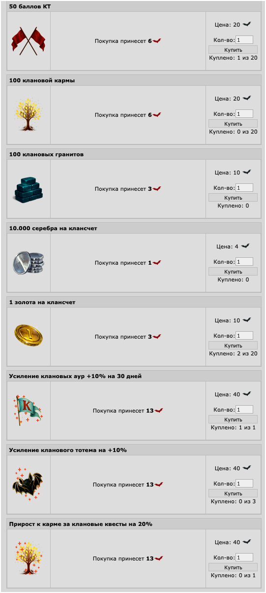 Вкладка "Клановый магазин". Как уже описывалось выше, при заполнении каждой шкалы клан также получает специальную валюту - Черный Вампир (ЧВ). Количество получаемых ЧВ зависит от номера шкалы: за закрытие [1 2 3 4 5 6 7 8 9 10 11 12 13+] шкалы клан получает [7 8 9 10 11 12 13 14 15 16 17 18 20] ЧВ. ЧВ отображается во вкладке "Клановый магазин" в формате X/Y (где X - количество доступных ЧВ, а Y - количество заработанных ЧВ за весь ивент). В этой вкладке расположен магазин клановых валют и бонусов, которые можно купить за ЧВ. Доступ к просмотру вкладки есть у всех сокланов, к покупке - только у тех, кто имеет в правах галочку “Может управлять ресурсами”.