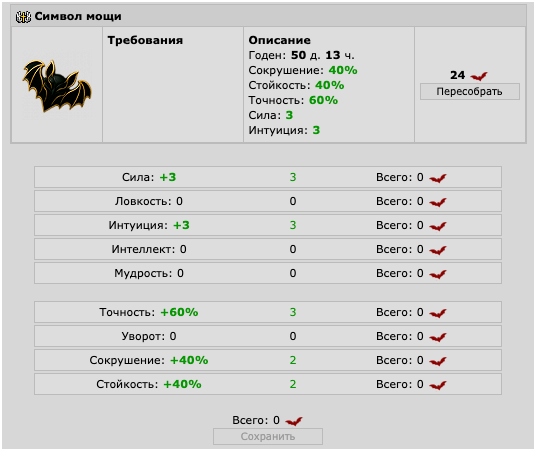 Интерфейс создания Символа похож на модификацию плаща господства, правила расходования КВ - тоже (каждое последующее улучшение параметра стоит на 1 ед. больше, чем предыдущее). Одно улучшение поднимает выбранный параметр (кроме здоровья) на 1 ед. и выбранный модификатор (кроме пробоев) на 20%. Параметры Символа модифицируются коэффициентом уровня персонажа, вычисляемым по формуле: 1+(Х-12)*0,6 где Х - текущий уровень персонажа; данный коэффициент не может быть ниже 0. Параметры искры, домноженные на уровневый коэффициент, каждый член клан может посмотреть в меню "Персонаж" при наведении на ауру.