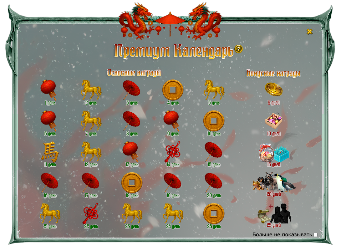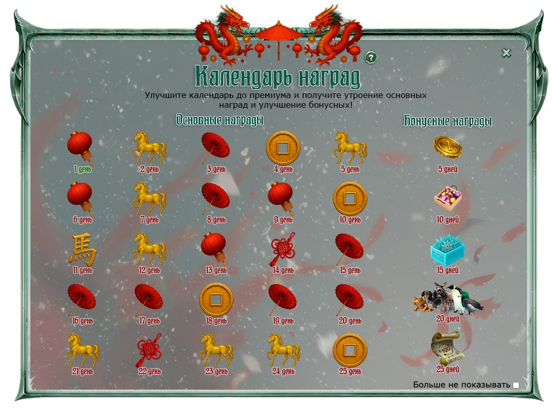 Бонусные награды: - 30 золота; - Малый набор концентратов (по 20 бутылочек Концентрата роста умений I, Концентрата роста опыта I, Концентрата феникса и Зелий охотника); - - Набор развития* + Японский набор (из акции "Черная пятница") - Все виды животных на 20 дней (ворон - на 10 дней, ворон выдается только игрокам 21+ уровня, если уже есть животные, их срок продлевается); - Особые условия на 7 дней (срок годности свитка 60 дней) + .Уникальный образ, вдохновленный темой китайского Нового года.